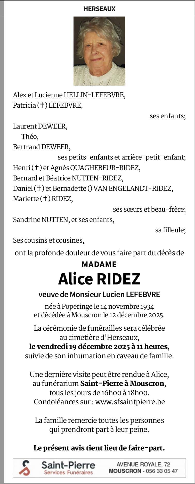 La cérémonie de funérailles sera célébrée au cimetière d’Herseaux, le vendredi 19 décembre 2025 à 11 heures, suivie de son inhumation en caveau de famille.