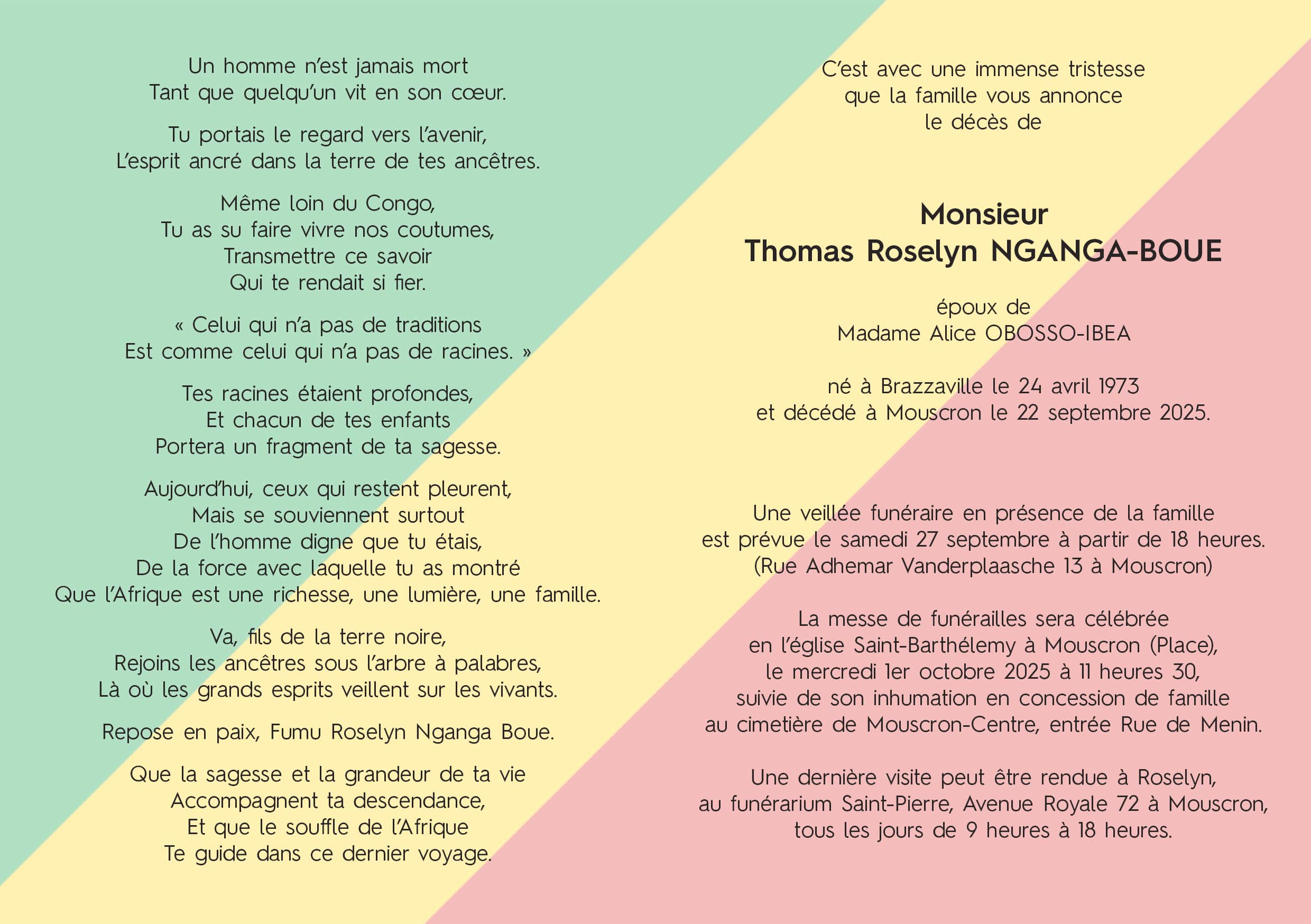 La célébration de ses funérailles aura lieu en l’église Saint-Barthélemy à Mouscron Place, le mercredi 1er octobre 2025 à 11 heures 30, suivie de son inhumation en concession de famille au cimetière du Mont-à-Leux.